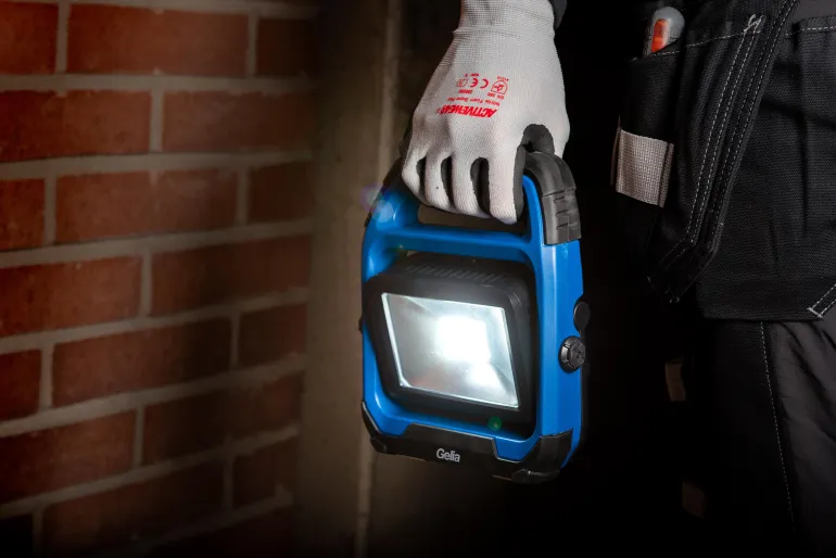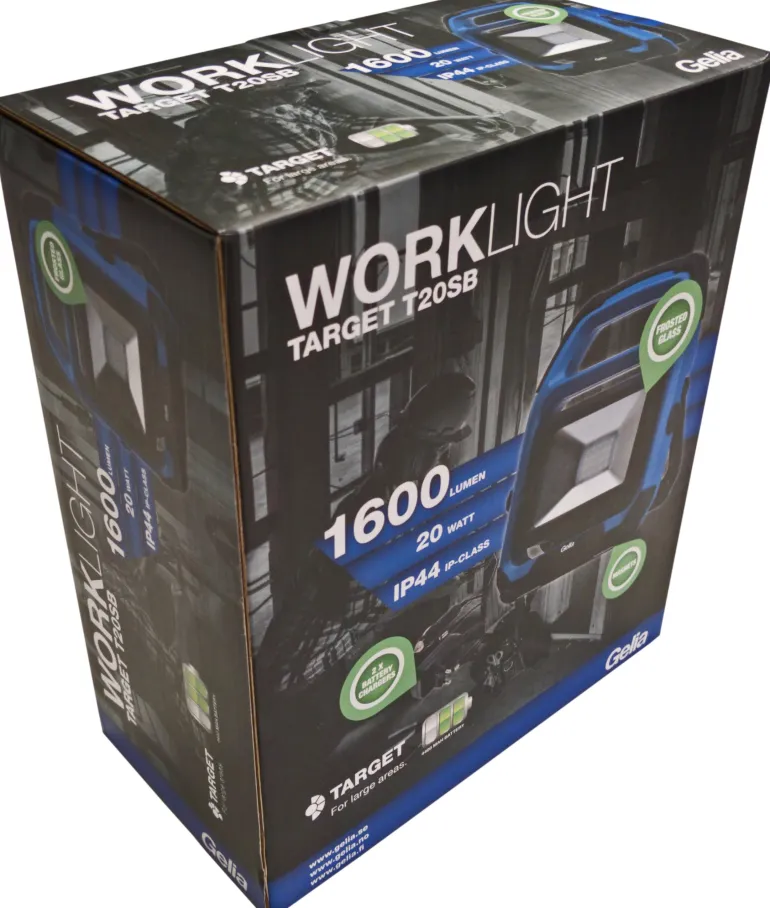 Gelia TARGET T20SB on kestävä ja kompakti LED-työvalaisin. Akkukäyttöinen LED-valaisin voidaan ladata 230 V:n pistorasiasta tai auton 12 V:n pistorasiasta mukana toimitettavalla muuntajalla. Valaisimen alapuolella on kaksi vahvaa magneettikiinnikettä, joiden ansiosta valaisin voidaan kiinnittää tukevasti metalliesineisiin. Kumipintaisen kahvan ansiosta työvalosta saa helpon otteen ja sitä on helppo kantaa. LED-valaisimessa on kaksi valotilaa: 100 % ja 50 %. Työvalaisimessa on sekä kääntyvä jalusta että kääntyvä kotelo, mikä helpottaa valon suuntaamista. Työvalaisimen USB-liitäntä SV DC 1A mahdollistaa muiden tuotteiden lataamisen valaisimenkautta. Latausaika 3,5/4 tuntia. Käyttöaika 2,5/5 tuntia. Suojausluokka IP44.
