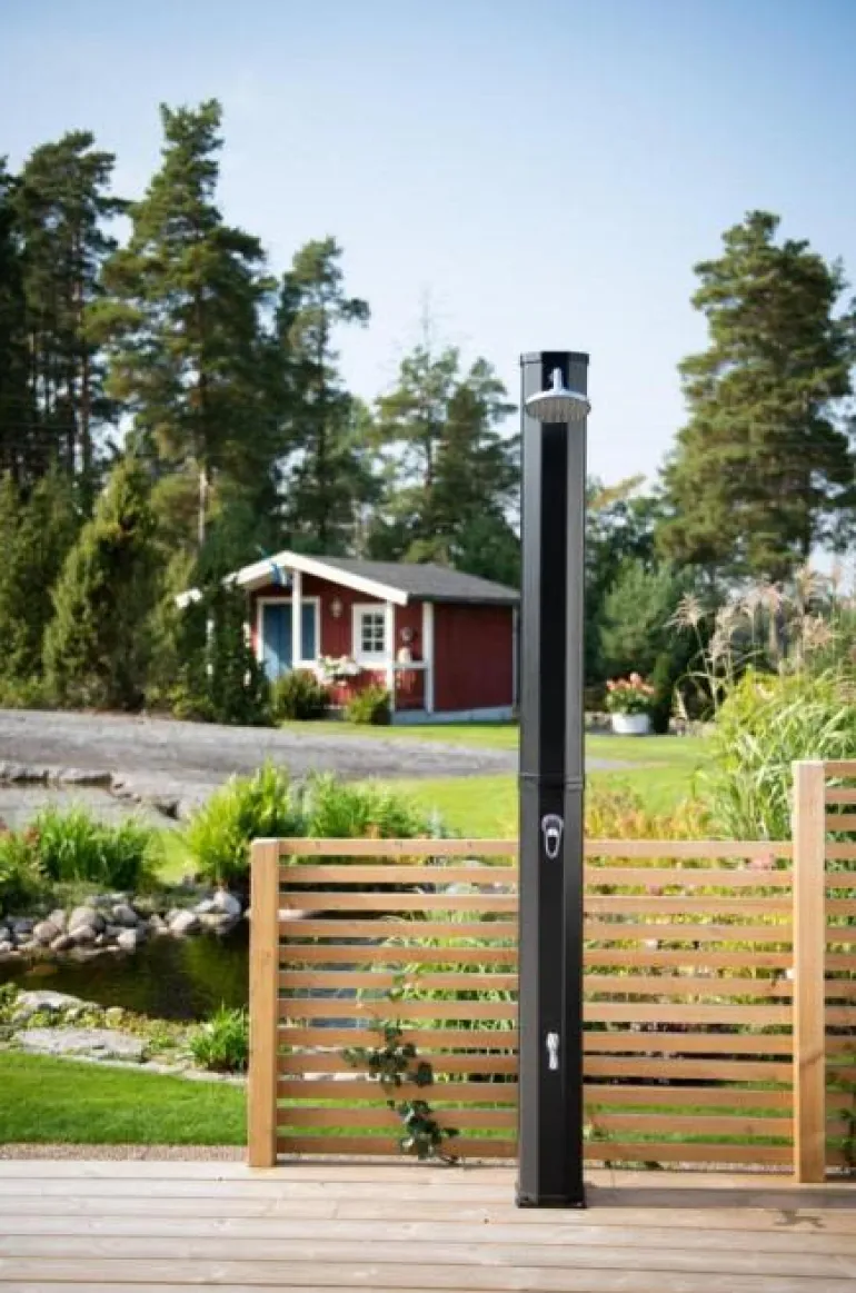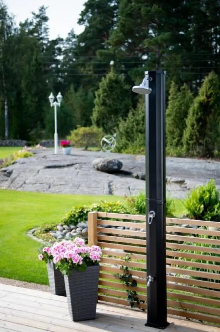 Ulkosuihku ei vaadi erillistä säiliötä tai virtalähdettä, minkä ansiosta se on helppo asentaa ja helppo sijoittaa haluamaasi paikkaan. Suihku on ankkuroitava johonkin, jotta se ei kaadu, kuten betonilaattaan tai vakaaseen puuterassiin, jolla on myös mukava seistä. Suihkua ei ole tarkoitettu pysyvään käyttöön, mutta sitä voidaan käyttää lisäsuihkuna kuumina päivinä tai huuhteluun ennen kylpemistä/uimista tai sen jälkeen. Jos tiedät, ettet käytä suihkua kolmeen päivään, se on tyhjennettävä vedestä kerrostumien estämiseksi. Ennen talvea ulkosuihku on aina tyhjennettävä vedestä, ja jäätymisen estämiseksi säilytettävä pakkasettomana. Ulkosuihku on myös jaettavissa kahteen osaan, ja vie näin vähemmän tilaa varastoitaessa.