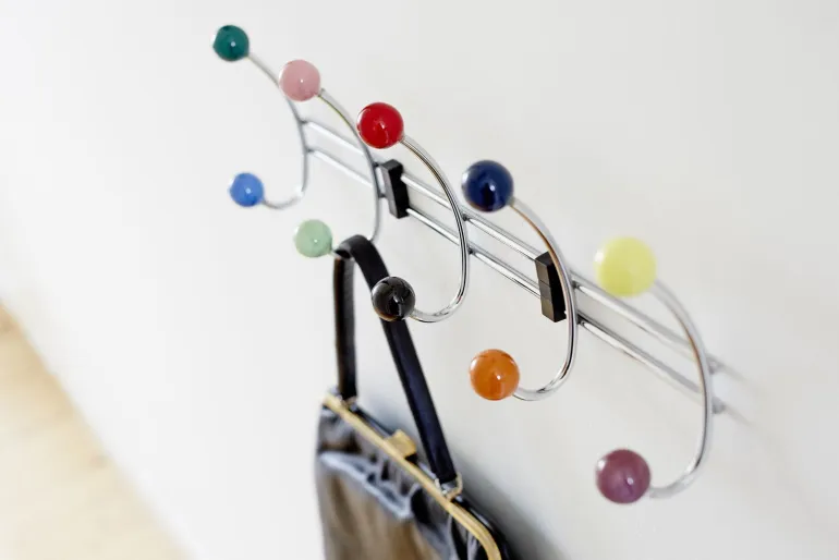 Ovinaulakko kromattua terästä, jossa mustat posliininupit. Sopii yhtä hyvin lastenhuoneeseen kuin eteiseenkin. Naulakko, jossa reilusti tilaa vaatteille, käsineille, pusseille jne.