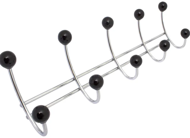 Naulakko kromattua terästä, jossa mustat posliininupit. Sopii yhtä hyvin makuuhuoneeseen kuin eteiseenkin. Naulakko, jossa reilusti tilaa vaatteille, käsineille, pusseille jne.