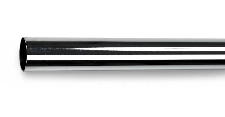 Valkoinen muovipäällysteinen vaatetanko, läpimitta 25 mm ja pituus 900 mm.