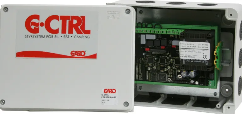 G-CTRL-järjestelmän vahvistin, jota käytetään vahvistamaan sähköliitännöistä ja ohjausyksiköstä lähetettyä signaalia. Kokoonpanossa tarvittavien vahvistinten lukumäärä määräytyy erikseen laitteiston varustelun mukaan. Vahvistin tulee kytkeä 3-vaiheeseen ja varmistaa 10 A:lla.