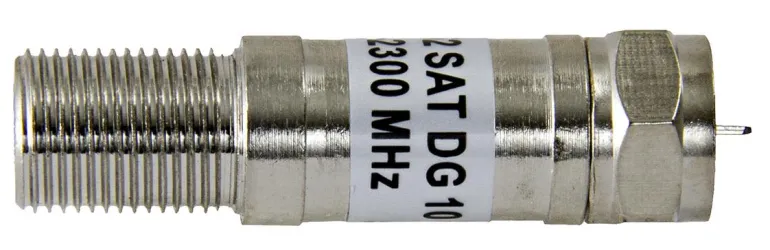 Vaimennin DC-liittimellä F-liitäntää varten (F-naaras – F-koiras). Laitetta voidaan käyttää impedanssin mukauttamiseen tai antennisignaalin vaimentamiseen. Taajuusalue 5-2400MHz.