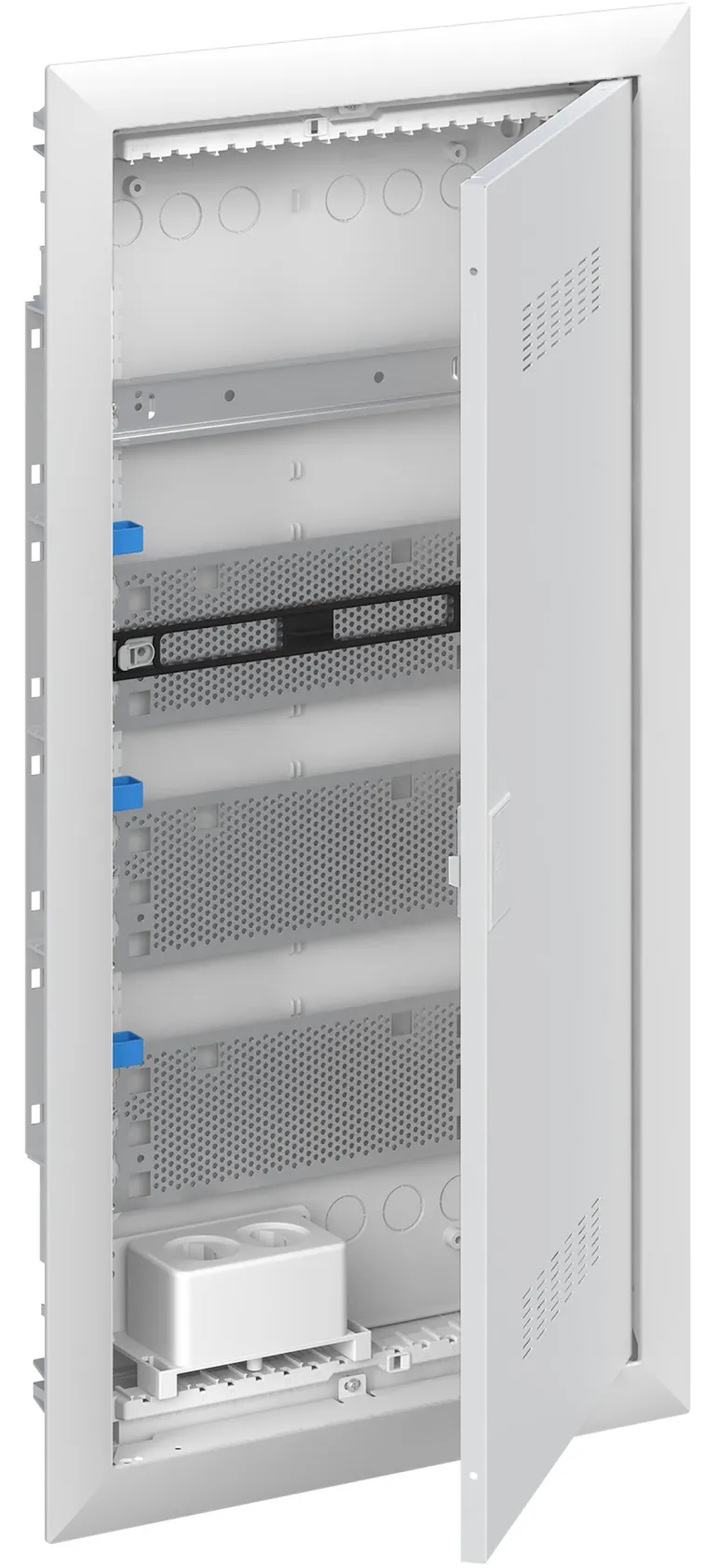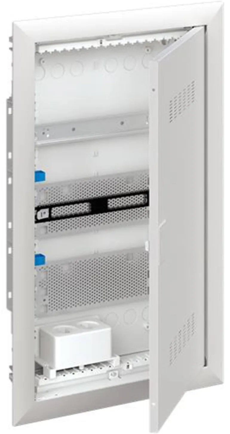 Vakiokeskuskotelo uppoasennukseen, sarjaan ABB UK600, ovikehyksellä ja ovella, kotelointiluokka II (kaksoiseristetty) ja IP30, sovellettavat standardit: EN 60670-24, IK-koodi 07, Nimelliskäyttöjännite 400V AC 50/60 Hz, nimellisvirta 63 A, hehkulangan resistanssi 850°C, jauhemaalattu, RAL 9016, kestomuovinen kotelo, jossa kehys ja ilmastoitu ovi, teräslevyovi, TIP-suljin, oven avauskulma 120 astetta, oven sarana oikealla tai vasemmalla, N/PE ja integroitu kaapelikiinnike.