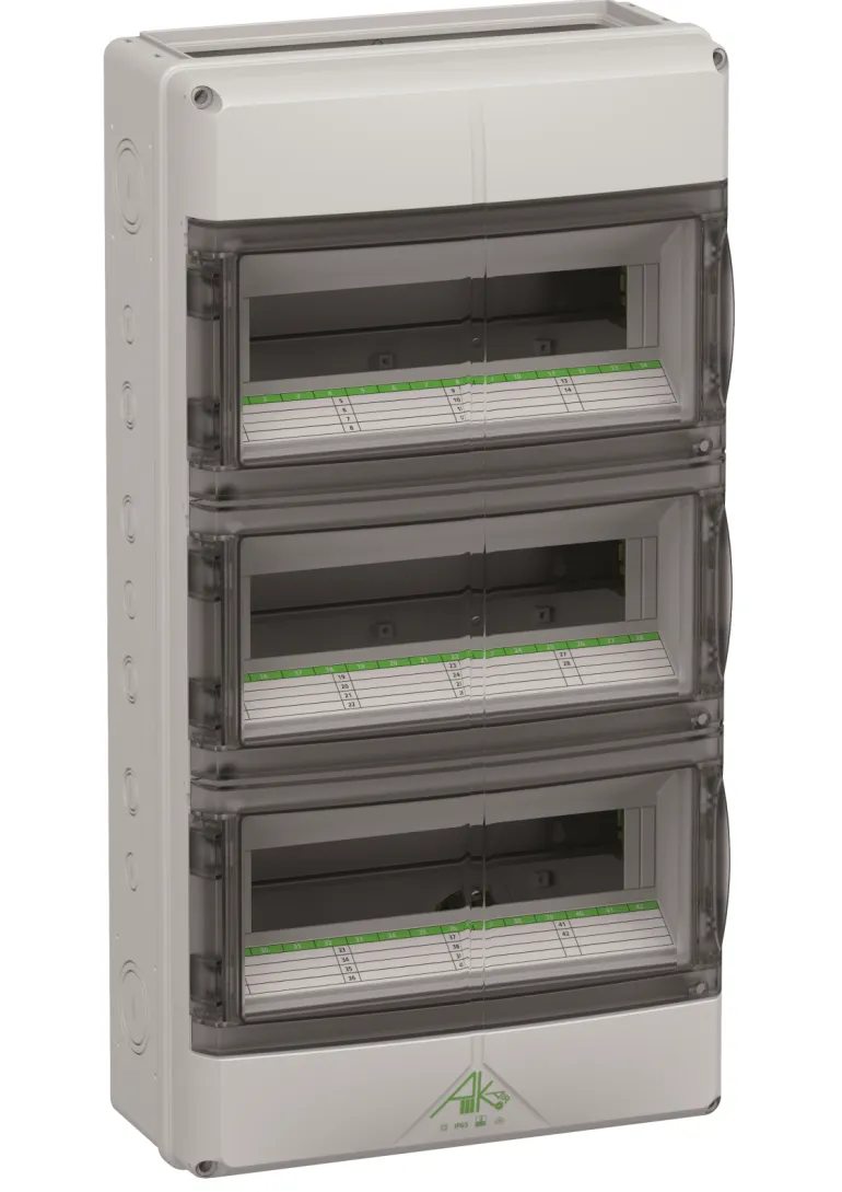Pinta-asennettava vakiokotelo, jossa on avoimet etusivut, käytettäväksi eri laippojen kanssa. Useiden AK-F-jakajien yhdistämiseen yhdistelmälaipalla. Varustettu 150 mm kiskojen välisellä etäisyydellä ja integroidulla ilmanvaihtoelementillä kondension vähentämiseksi.