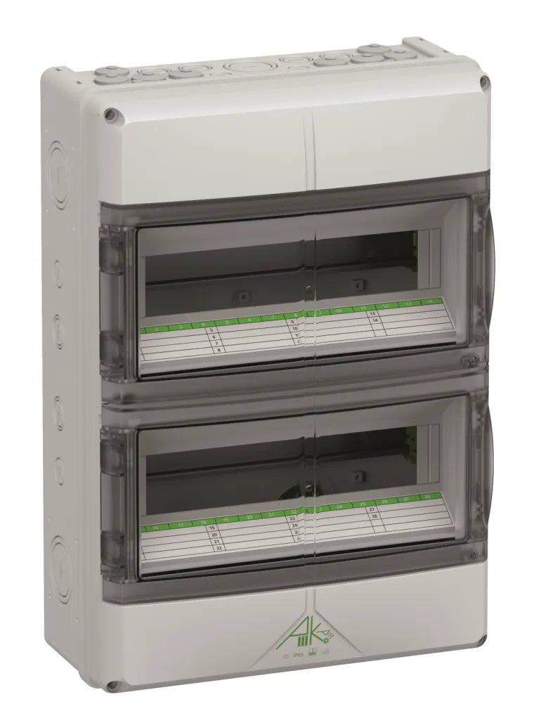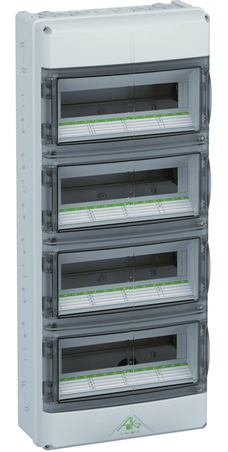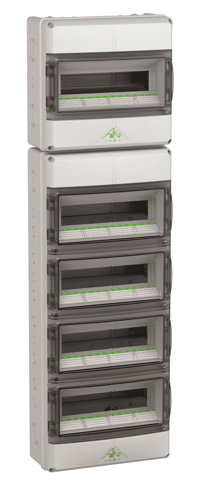 Ilmalla tuuletettava pinta-asennettava vakiokotelo, 150 mm kiskojen väli, integroitu ilmanvaihtoelementti kondension vähentämiseksi, joustavat insertit ylhäällä, suoja- ja tekstitarrat, ylimääräisellä kaksoistiivistyskalvolla ja lisätarvikkeilla, suojausluokka IP65, suojausluokka II, halogeeniton, VDE-hyväksytty, iskunkestävyys IK08, ruuviton PE/N-puristuskisko, ammoniakinkestävä.