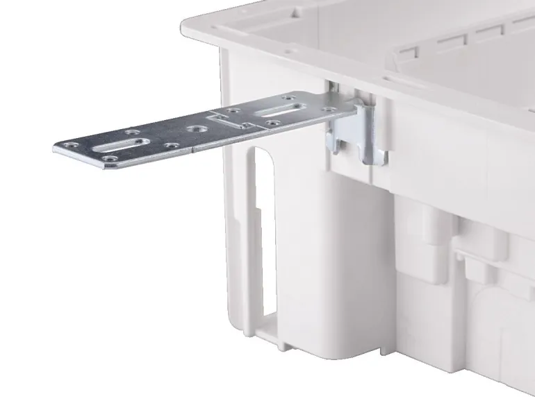 Upotettava vakiokotelo rei ’itetyille seinille, asennussyvyys enintään 90 mm. Irrotettavat kaapelin kiinnityslaipat, saapuvien kaapeleiden kannattimet.