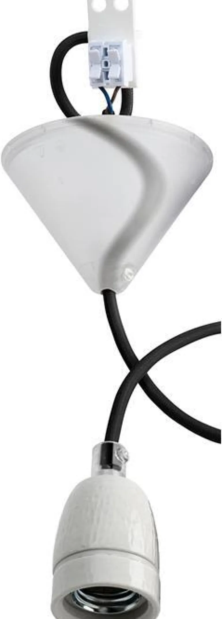 Posliinivalaisinkaluste valkoisella tekstiilikaapelilla, valaisimen pidikkeellä, johdon lyhentimellä, pikaliitännällä ja läpikuultavalla kattokuvulla, jossa on sivuruuvi.