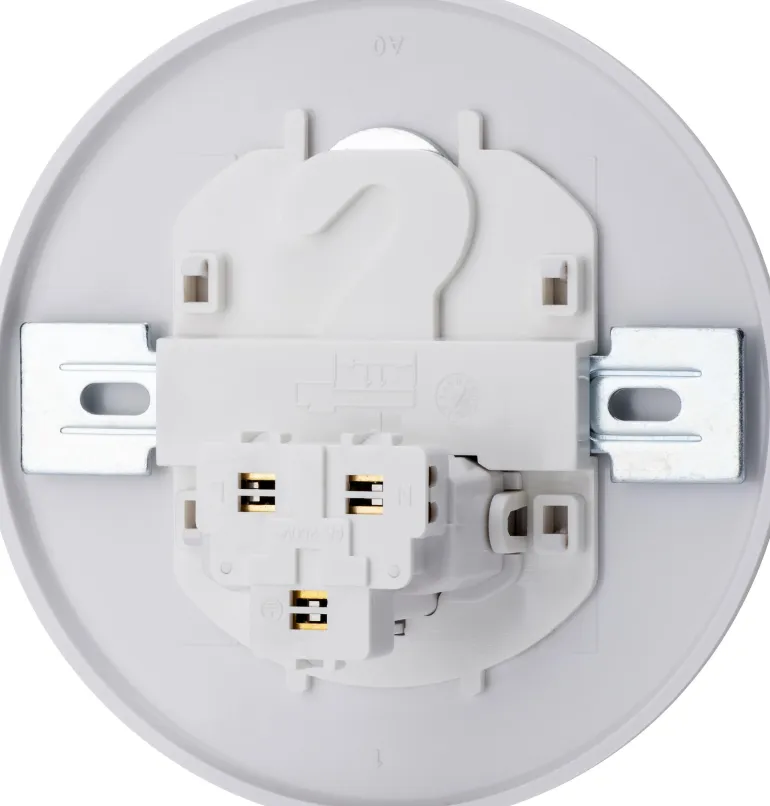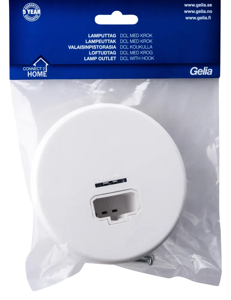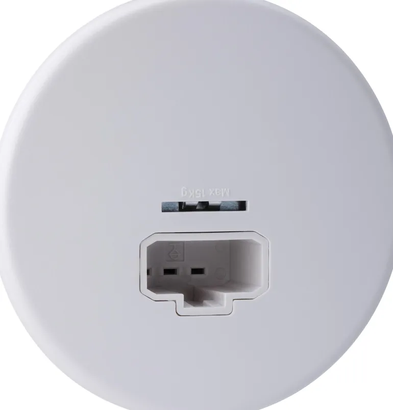Pyöreä valaisinpistorasia kattoasennukseen. Asennus kattorasiaan c/c 70 mm. Valaisinpistorasiassa on ripustuskoukku, johon kestää enintään 15 kg:n painon. DCL-laitteita tulee käyttää vain maadoitettujen järjestelmien kanssa.
