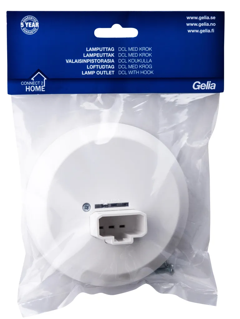 Pyöreä valaisinpistorasia (DCL) pinta-asennukseen kattoon. Voidaan asentaa myös kattorasian (c/c 70 mm) päälle. Valaisinpistorasiassa on ripustuskoukku, johon kestää enintään 15 kg:n painon. Integroitu pohjalevy helpottaa asennusta. DCL-laitteita tulee käyttää vain maadoitettujen järjestelmien kanssa.