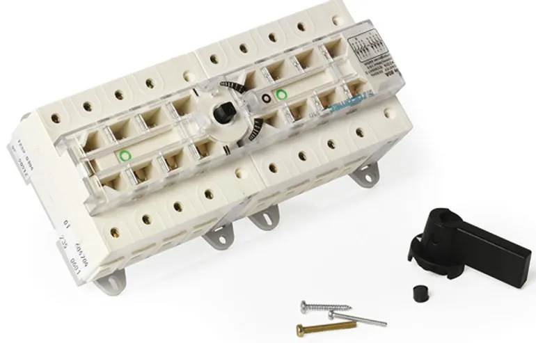 Kytkin 1-0-2 DIN-urille näkyvällä murtopisteellä. Liitäntäalue: Cu 50 mm²