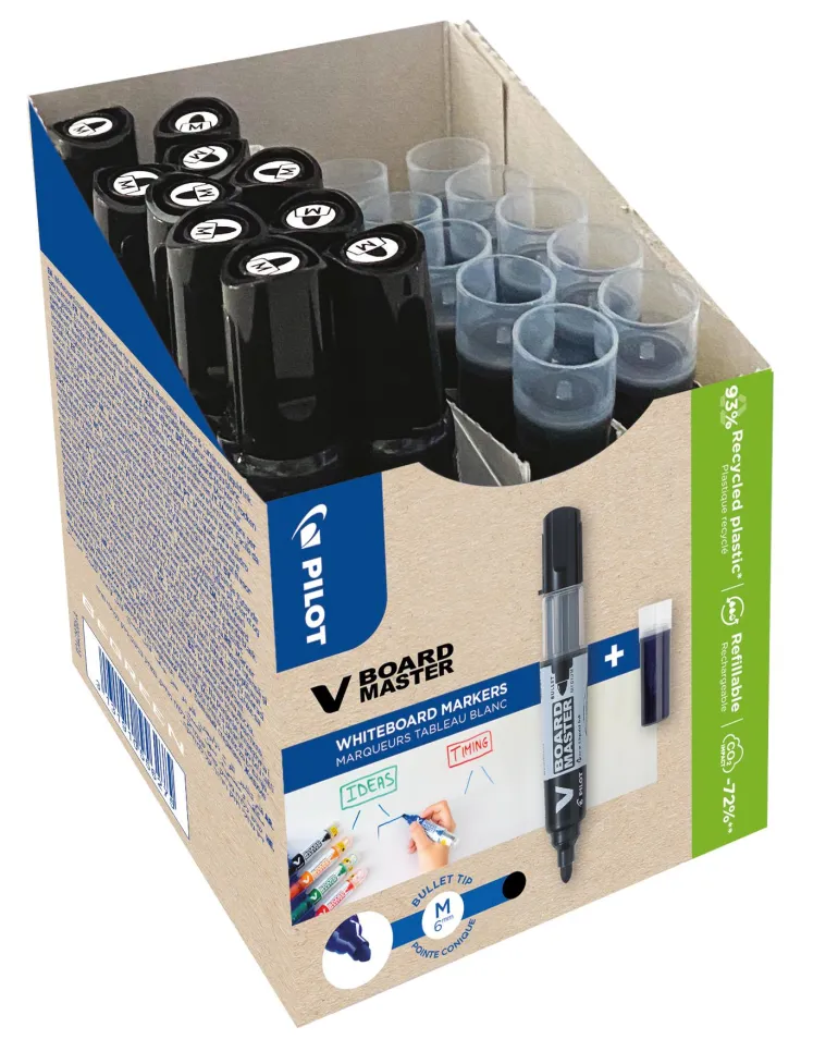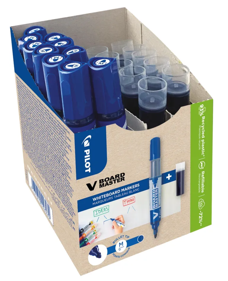 Pilot V-Board Master on uudelleentäytettävä valkotaulutussi, jossa on innovatiivinen mustejärjestelmä. Sen ansiosta voit kirjoittaa ilman, että kynää tarvitsee pumpata tai ravistaa käyttöön. Järjestelmä varmistaa tasaisen mustevirtauksen kynän kärkeen. Kynän värikylläinen muste kirjoittaa viimeiseen pisaraan asti ilman haalistumista. V-Board Master kuuluu Pilotin BeGreen-valikoimaan, ja se on valmistettu 91-prosenttisesti kierrätetystä muovista. Kolmesti täytetty kynä vähentää hiilidioksidipäästöjä 75 % verrattuna neljään uuteen kynään. Pakkaus sisältää 10 kynää ja 10 täyttöpakkausta.