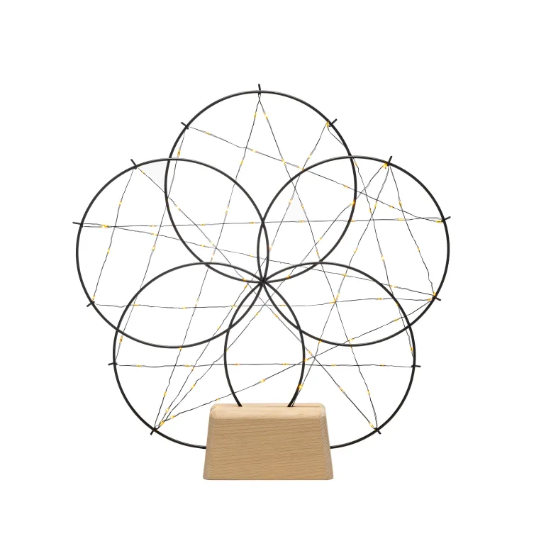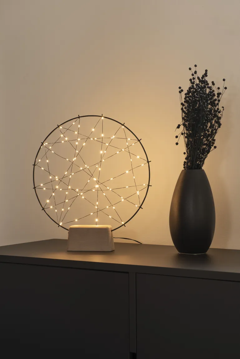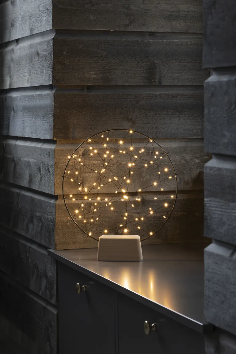 Konstsmide 1783-787 on pyöreä musta valokoriste (metalli), jossa puujalusta. 100 mikro-LEDiä (valon väri amber), 4,5V/IP20.