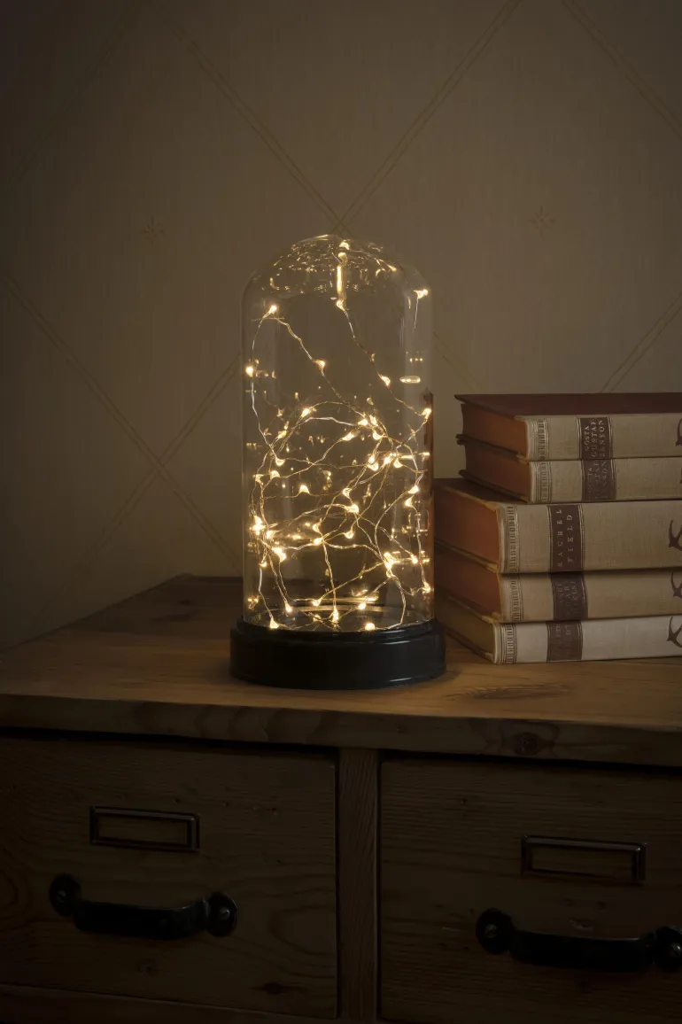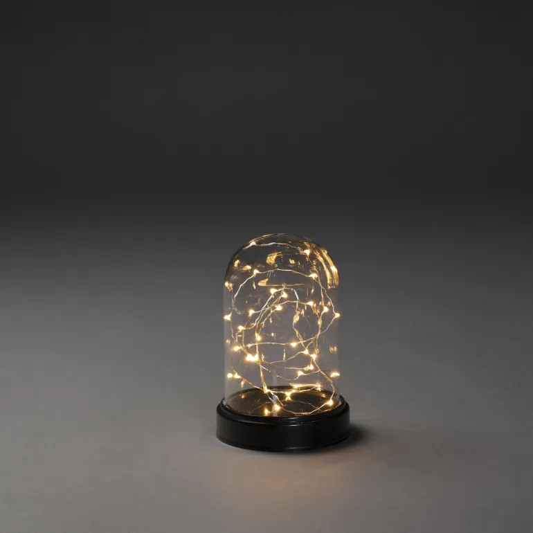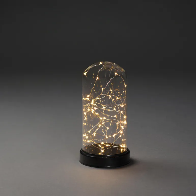 Konstsmide 1216-877 on valokoriste (lasikupu valosarjalla), jossa 50 amber-väristä LEDiä, 23 cm. Ajastin 6 h.