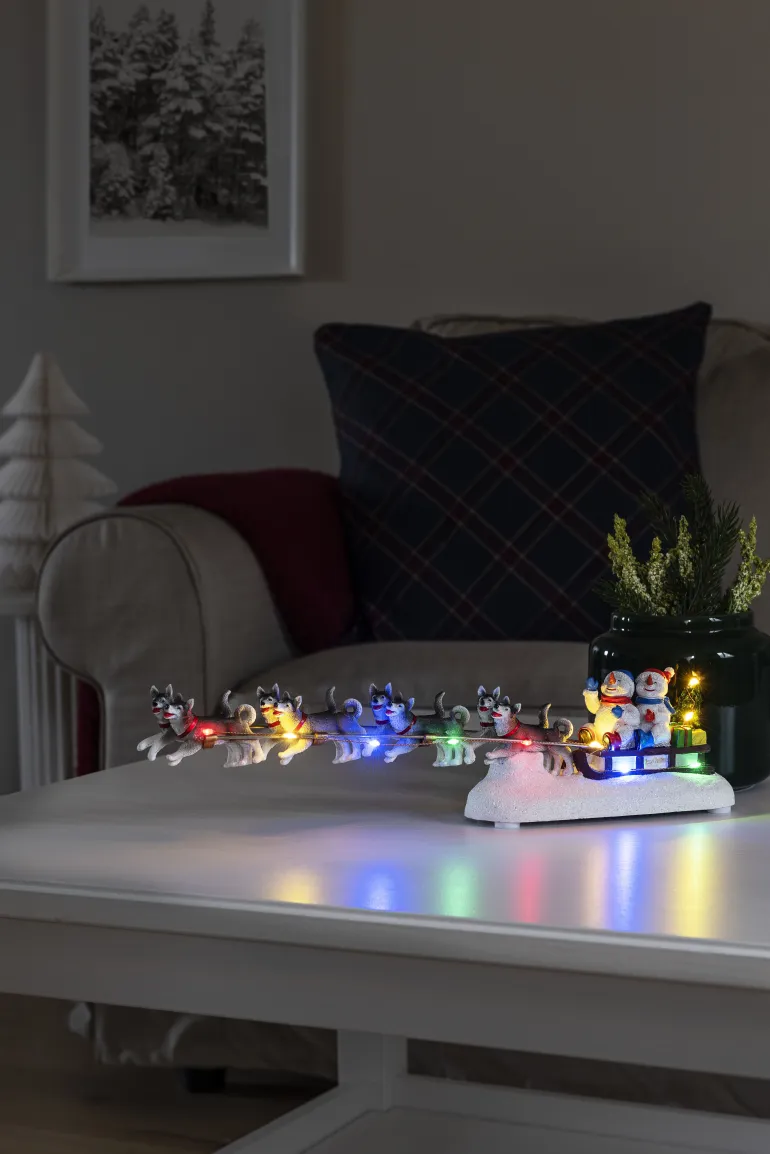 Konstsmide 4242-000 on joulukoriste (lumiukot ja koiravaljakko), jossa 10 moniväristä LEDiä. 2xAA, Ajastin 6 h.