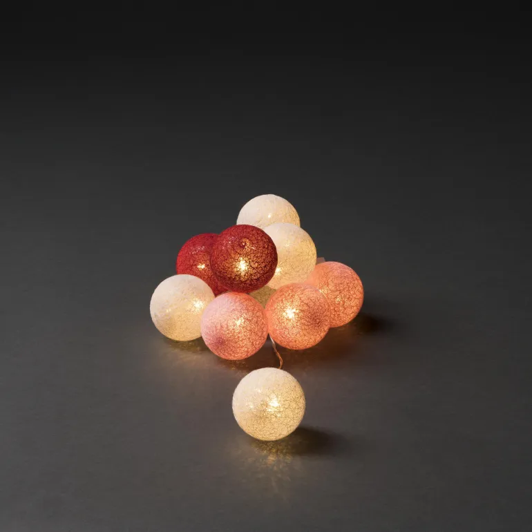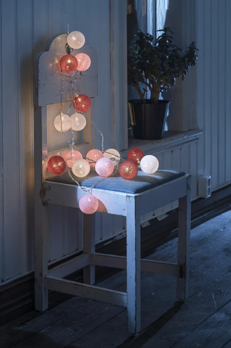 Konstsmide 3134-503 on valosarja, jossa on 16 lankapalloa (6 cm, valkoinen/punainen/vaaleanpunainen) LEDeillä. 24V/IP20. Valosarjan pituus 3 m (liitäntäjohto 3 m).