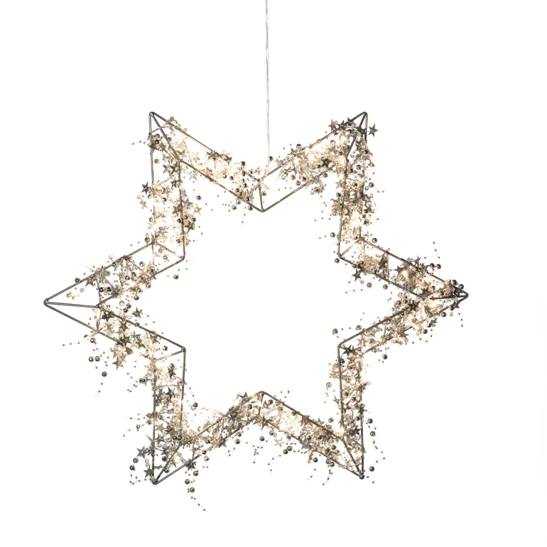 Konstsmide 1795-803 on tähdenmuotoinen valokoriste 60 cm (valokranssi, messinki). 90 LEDiä, valon väri amber. 3V/IP44.