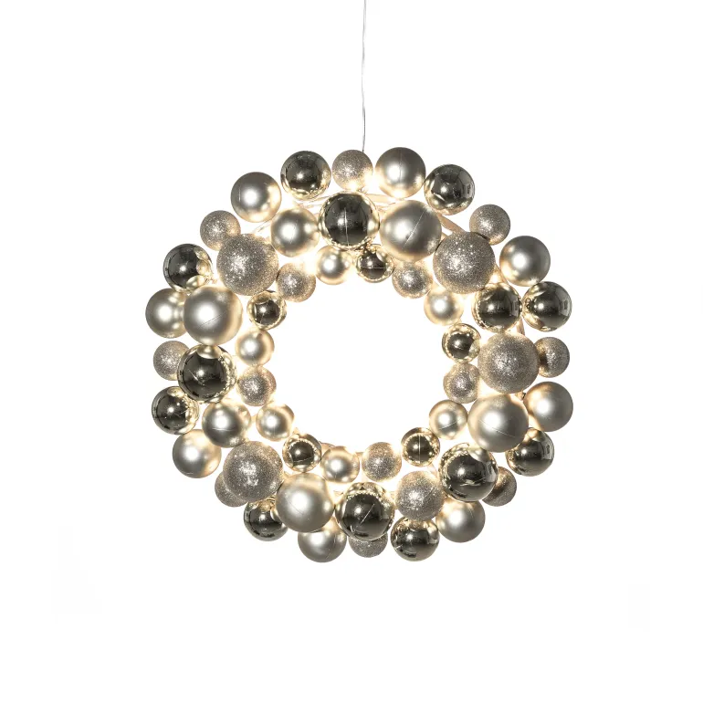 Konstsmide 3783-303 on valokranssi 40 cm (hopea), jossa on 50 lämpimän valkoista LEDiä. Ajastin 9 h, 4 x AA-paristoa.