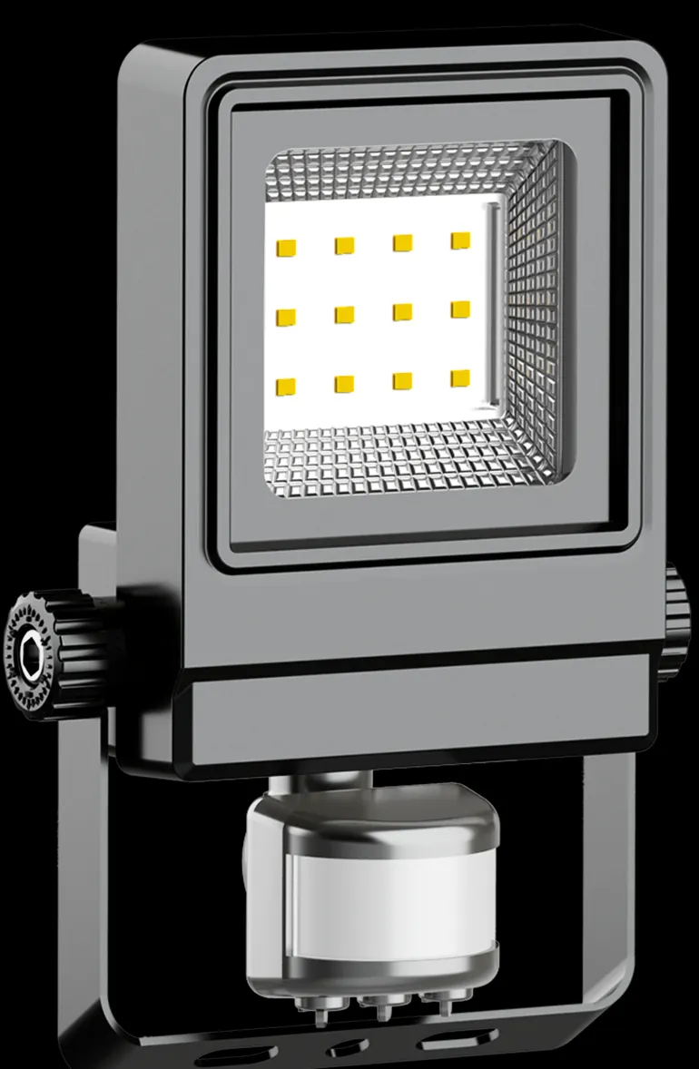 Vesitiivis 10 W LED-valonheitin, joka soveltuu sekä sisä- että ulkokäyttöön. Valaisimessa on integroitu liiketunnistin ja se voidaan helposti kiinnittää säädettävällä kiinnikkeellä seinään tai kattoon.