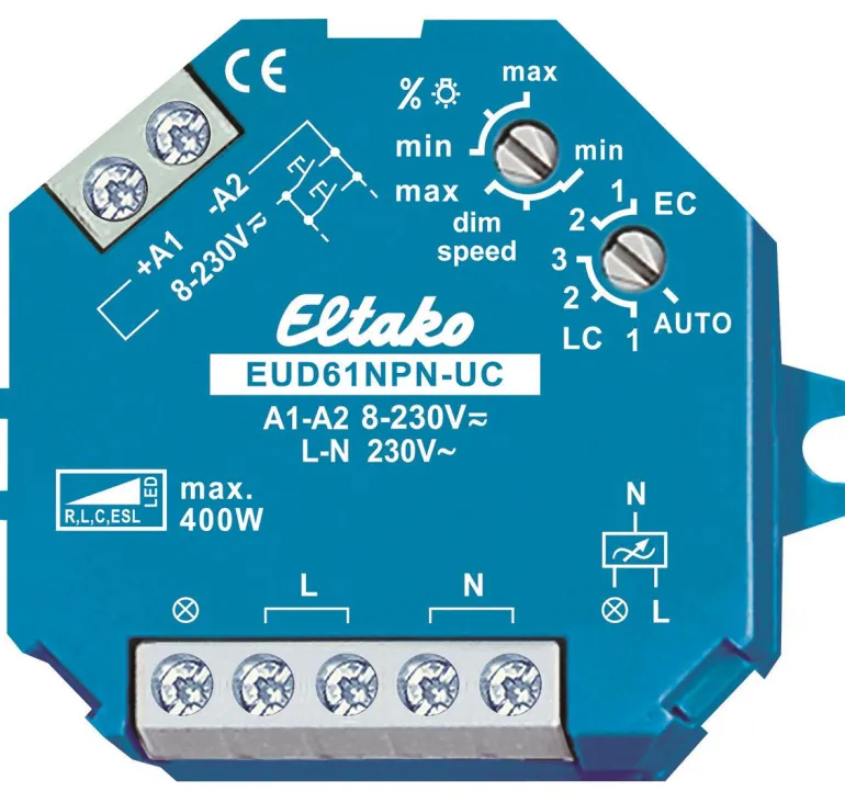 Himmennä kaikki himmennettävät kuormat. Katkaisukapasiteetti jopa 400 W, varaus ilmanvaihto-olosuhteissa. Sitä ohjataan jousikuormitetulla painikkeella. Vähimmäiskuorma 0W. Vähimmäisvaloisuus voidaan säätää, hyödyllistä esimerkiksi himmennettäville matalaenergialampuille. Himmennysnopeus voidaan säätää dim.speed-toiminnolla, mikä myös asettaa nopeuden pehmeästi päälle ja pois päältä. Nollatehokytkin ja pehmeä käynnistys säästävät valonlähteitä. Erityiset mukavuustilat himmennettävälle 230V LEDILLE ja jopa 100 W:n matalaenergiavalonlähteille. Lastenhuone- ja nukahdustoiminnoilla. Himmennin vaatii nollajohdon.