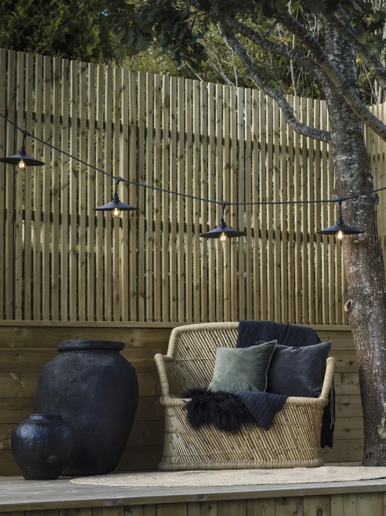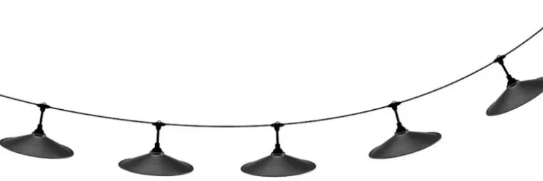 Flex Out -valosarja (IP44) 5 x E27-lampunpitimellä (maks. 15W) ja varjostimella. Kokonaispituus 6,5 m, 2,5 m ensimmäiseen lampunpitimeen, sitten 80 cm kunkin lampunpitimen välillä. Etäisyys alas varjostimeen 15 cm. 5 kpl Lamina -varjostimia (musta jauhemaalattu metalli). Varjostimien leveys 29 cm ja korkeus 8 cm.