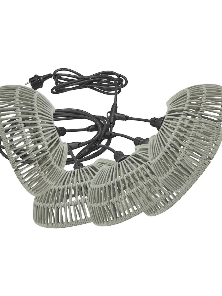 Flex Out -valosarja (IP44) 5 x E27-lampunpitimellä (maks. 15W) ja varjostimella. Kokonaispituus 6,5 m, 2,5 m ensimmäiseen lampunpitimeen, sitten 80 cm kunkin lampunpitimen välillä. 5 kpl Hue -varjostimia polyrottingista (väri hiekka).