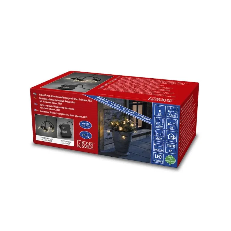Konstsmide 2373-800 on paristokäyttöinen valosarja sisältäen 10 kappaletta LED-lamppuja (valon väri amber). Hyväksytty ulkokäyttöön, soveltuu erinomaisesti luomaan tunnelmaa parvekkeelle tai terassille. Sisältää myös ajastimen 6h. Paristot eivät sisälly toimitukseen (4 x AA-paristot).