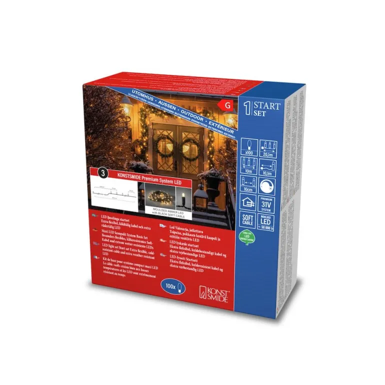Konstsmide 4912-817 on valosarja 100 M-LEDillä (valon väri amber), joka soveltuu ulkokäyttöön (IP44). Valonlähde ei ole vaihdettavissa.