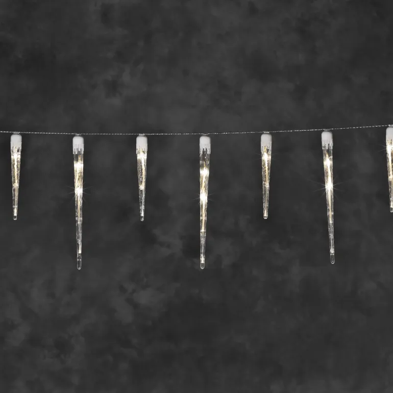Konstsmide 2736-802 on valosarja, jossa on 32 jääpuikkoa ja 48 LEDiä (valon väri amber). Valkoinen johto 24V / IP44. Valosarjan pituus 775 cm (liitäntäjohto 1000 cm).
