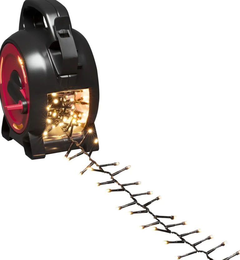 Konstsmide 3843-100 on valosarja kelalla, jossa on 300 lämpimän valkoista LEDiä (cluster). Musta johto.