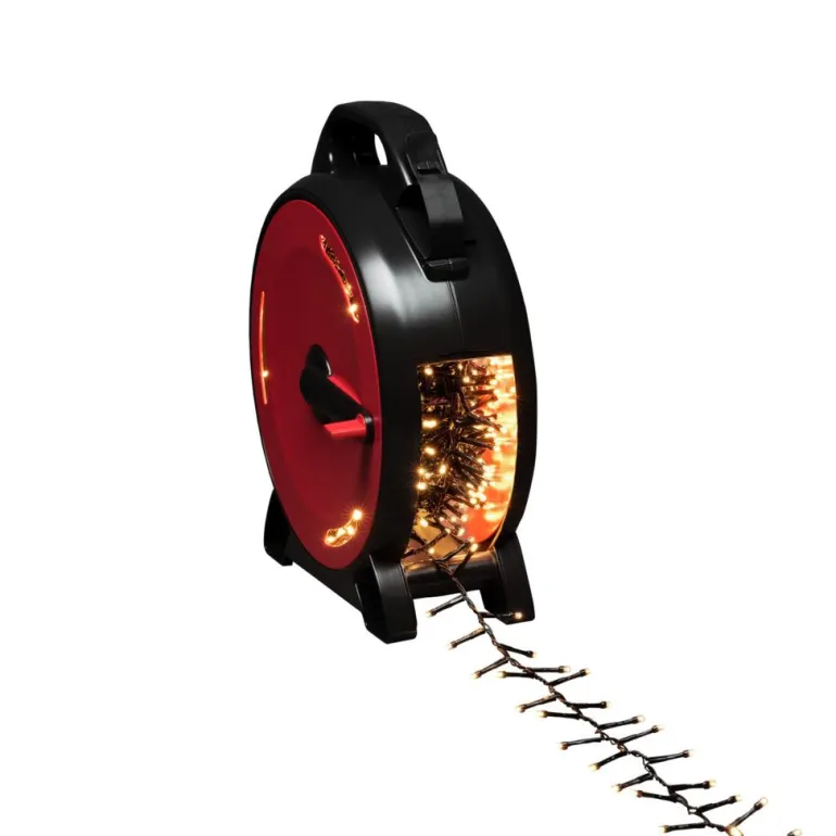 Konstsmide 3843-100 on valosarja kelalla, jossa on 300 lämpimän valkoista LEDiä (cluster). Musta johto, 30V/IP44.