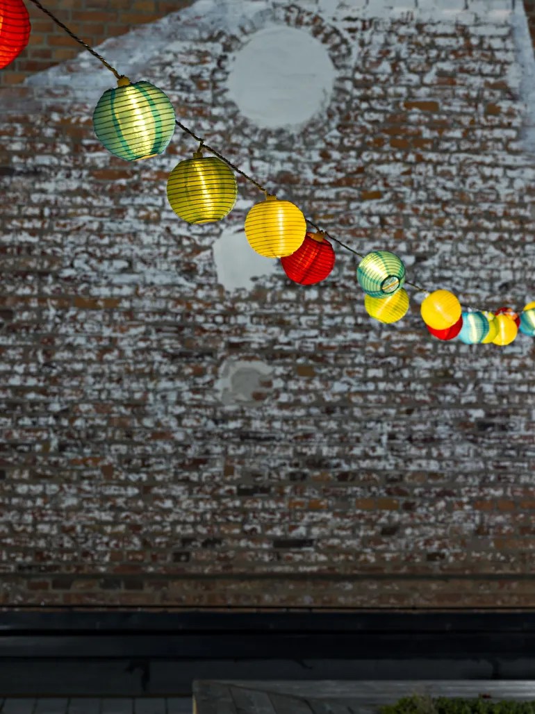 Konstsmide 4160-502 on valosarja 20 värillisellä pallolla, joissa lämpimän valkoiset LEDit. Valkoinen johto. 24V/IP44. Valosarjan pituus 4,75 m (liitäntäjohto 10 m).