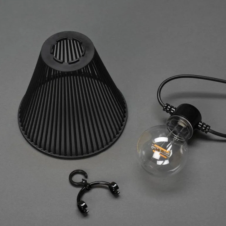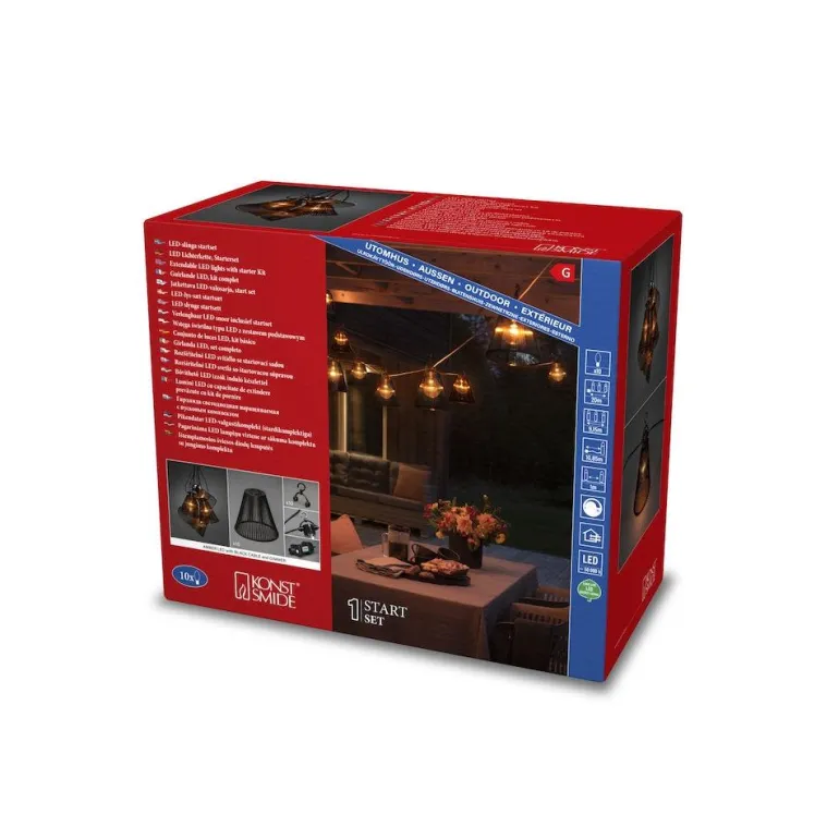 Konstsmide 2333-870 on valosarja sisältäen 10 kappaletta amber-värisiä ja himmennettäviä LED-lamppuja. Sisältää myös pienet mustanväriset varjostimet, jotka lisäävät valosarjan tunnelmallisuutta. Hyväksytty ulkokäyttöön, soveltuu erinomaisesti luomaan tunnelmaa parvekkeelle tai terassille.