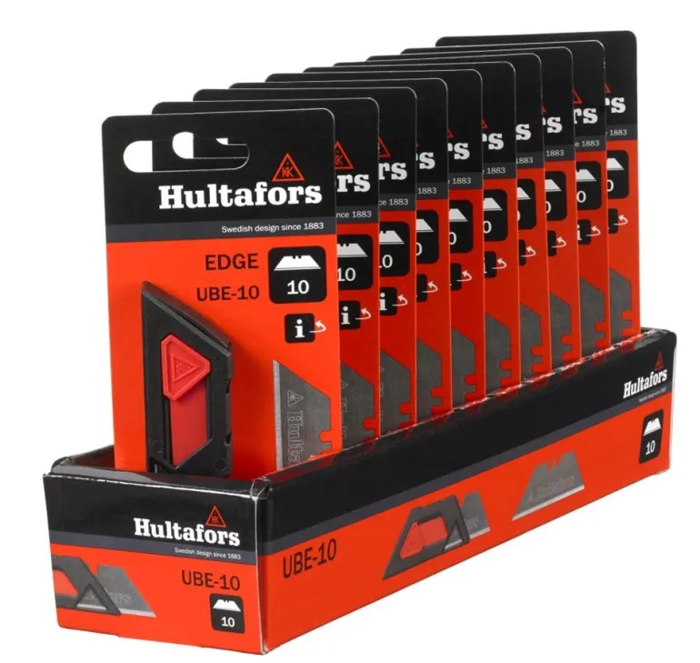 Erittäin terävä terä tarkkaan työskentelyyn, kun leikkausvaatimukset ovat erityisen korkeat. Edge terät ovat valmistettu karkaistusta SK2 hiiliteräksestä. Terävemmät kuin Allround-terät, mutta myös hauraammat. Tulevat käytännöllisessä 10 terän jousitetussa pakkauksessa, joka helpottaa teränvaihtoa. Pakkaus mahtuu Hultafors yleisveitsien kädensijan sisälle ja myös käytetyt terät voi laittaa kotelon kääntöpuolelle säilöön, jolloin työpisteesi pysyy siistinä ja turvallisena.