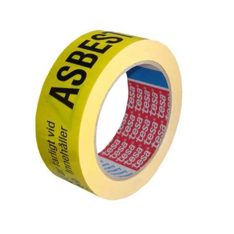 PVC-kalvovaroitusteippi asbestijätteen merkintää ja asbestijätteestä varoittamista varten. Teippi kiinnittyy tehokkaasti useimmille pinnoille.
