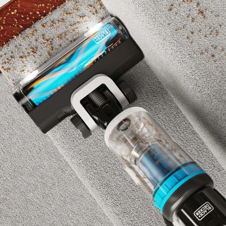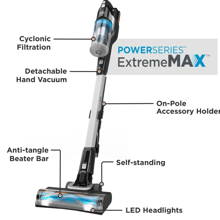 18V POWERSERIES™ Extreme MAX™ -varsi-imuri/akkuimuri itsepuhdistuvalla harjarullalla, jonka uusi muotoilu ehkäisee hiusten ja muun lian tarttumisen. Syklonisuodatuksella, joka mahdollistaa erinomaisen lian erotuksen optimaalisen suorituskyvyn ylläpitämiseksi.