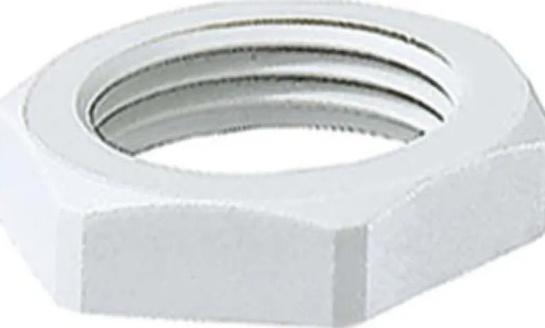 Vaaleanharmaa lasikuituvahvisteinen polyamidivastamutteri. Lämpötila-alue -20°C…+100°C.