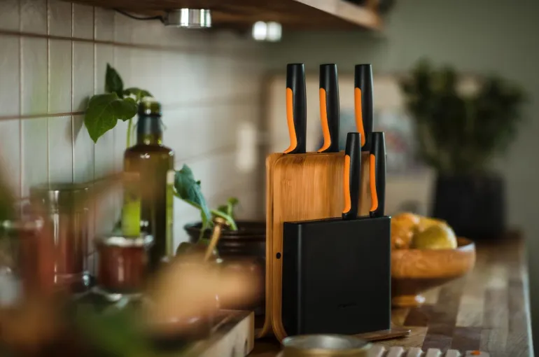Bambusta ja muovista valmistettu veitsiteline, jossa on viisi yleisintä keittiöveistä. Veitsiteline on kompakti, pystyasennossa. Helppo ulottuvuus mahdollistaa sijoittamisen vaikka matalienkin yläkeittiökaappien alle.