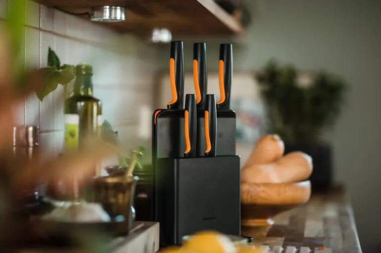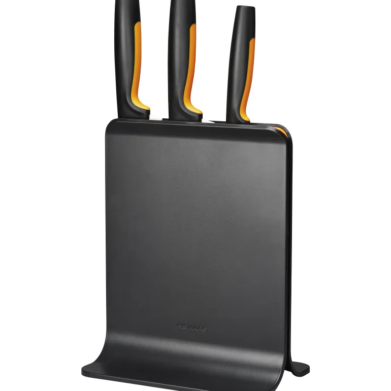 Muovinen veitsiteline, joissa on viisi yleisintä keittiöveistä. Veitsiteline on kompakti, pystyasennossa.