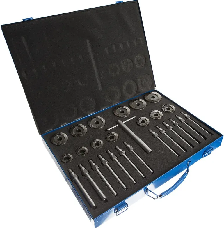 PELA 489055 on venttiili-istukan jyrsinsarja, joka sisältää 13 erilaista varrellista jyrsintä ja kahvan. Metallisessa säilytyslaukussa, jossa sisusmuotti osille. Koko jyrsimet 45°: 30 / 32.5 / 35 / 37.5 / 40 / 42.5 / 45 / 47.5 / 50 / 52.5 / 55 / 57.5 ja 60 mm. Koko varret: 6 / 6,5 / 7 / 7,5 / 8 / 8,5 / 9 / 9,5 / 10,5 / 11 / 11,5 ja 12 mm. Varsien pituus 89 mm.