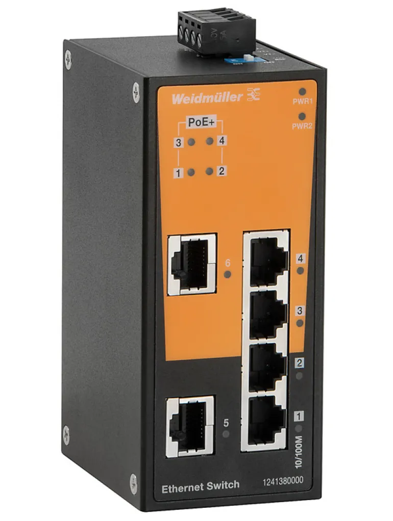 IE-SW-BL06-2TX-4POE on verkkokytkin, ei-hallittava, Gigabit Ethernet, portit 2 x RJ45 10/100/1000BaseT (X) ja 4 x RJ45 10/100/1000BaseT(X) PoE+, IP30, ja ympäristön lämpötila 0 °C…60 °C.