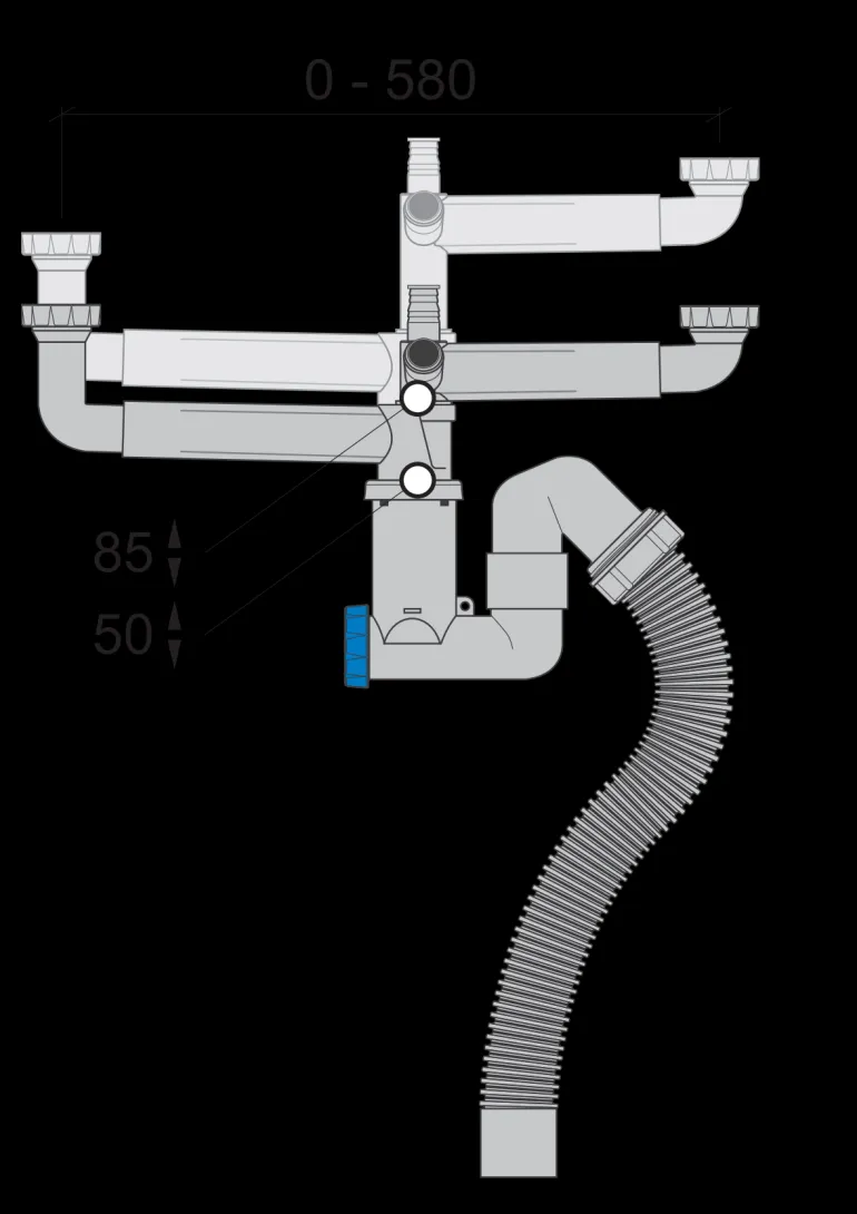 Pesualtaan vesilukko DB-Lås II kahdelle altaalle, letkulla.