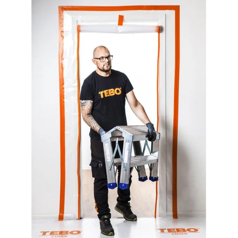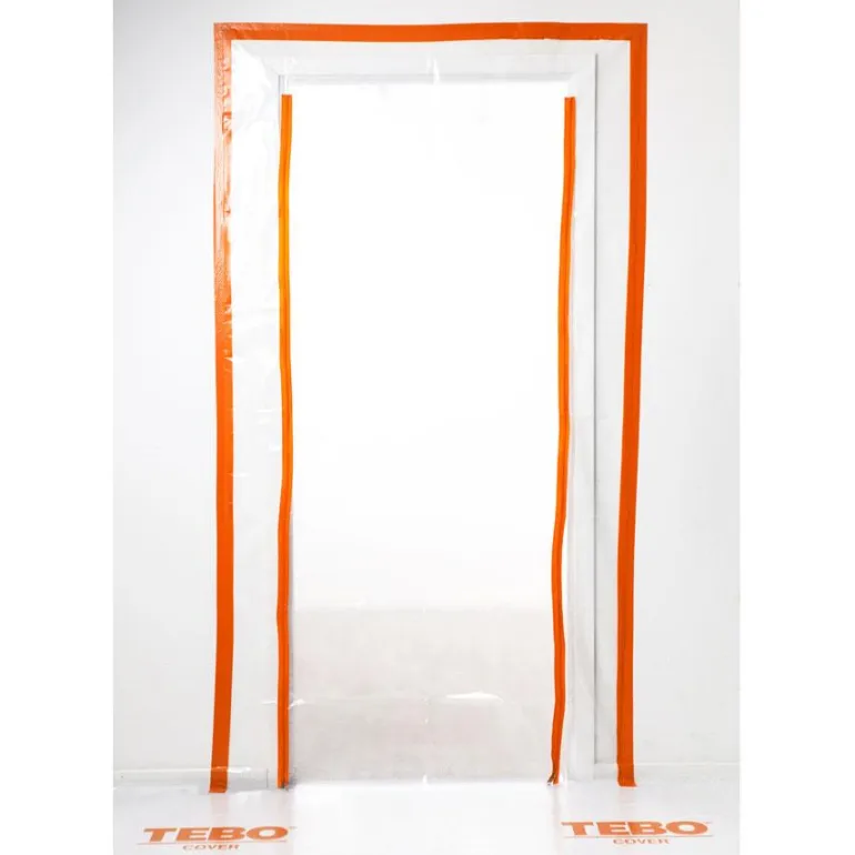 TEBO Cover 869636 on HDPE-muovista valmistettu vetoketjullinen ovi, jota käytetään suojana oviaukoissa, esimerkiksi remontin aikana. Kaksi suoraa lattiaan asti ulottuvaa vetoketjua – leveä aukko. Ovi kiinnitetään teipillä.