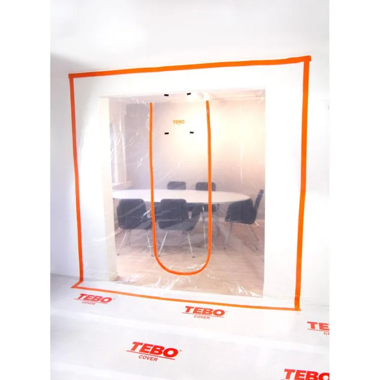 TEBO Cover 869632 on HDPE-muovista valmistettu vetoketjullinen ovi, jota käytetään suojana oviaukoissa, esimerkiksi remontin aikana. U-muotoiset vetoketjut tekevät alareunasta tiiviin. Ovi kiinnitetään teipillä.