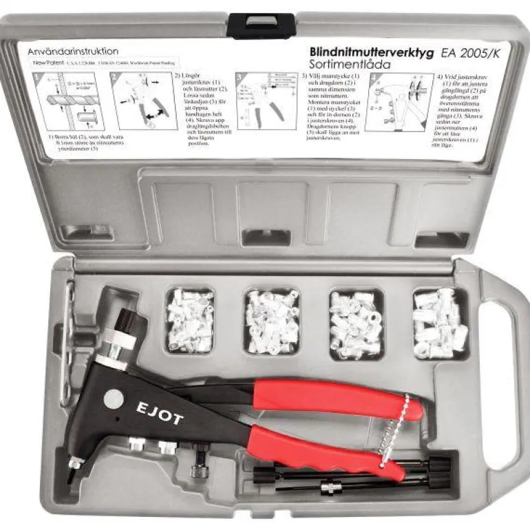 Vetoniittimutterisarja, joka sisältää kiinnitystyökalun PNT110, jossa on vetotuurnat ja suukappale sekä pora. Alumiiniset sokkoniittimutterit tasakannalla materiaalille, jonka paksuus on 0,25–3,0 mm. Toimitetaan lokeroidussa muovilaukussa.