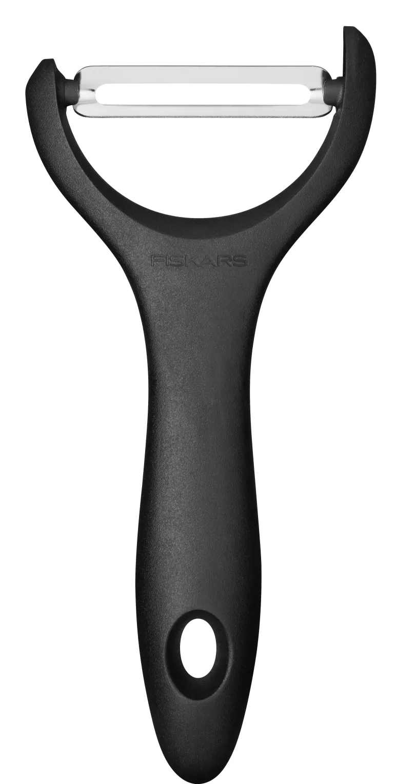 Fiskars Essential -Y-mallinen vihanneskuorija liikkuvalla terällä. Kääntyvän teränsä ansiosta kuorija mukautuu kuorittavan hedelmän tai kasviksen muodon mukaisesti. Ergonomisella, ripustusreiällä varustetulla kahvalla.