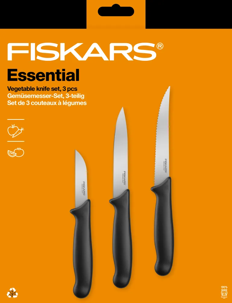 Fiskars Essential -veitsisetti sisältäen kolme vihannesveistä ruostumattomasta teräksestä. Setti sisältää kuorima-, tomaatti- ja vihannesveitsen. Konepesunkestävät.