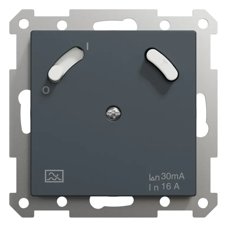 Exxact -vikavirtasuojakytkin ANT, 16A. ON/OFF -kytkimellä ja testipainikkeella. Tyyppi A versio, 30 mA. Uppokojerasiaan c/c 60 mm tai 35 mm syvään pintakojerasiaan.