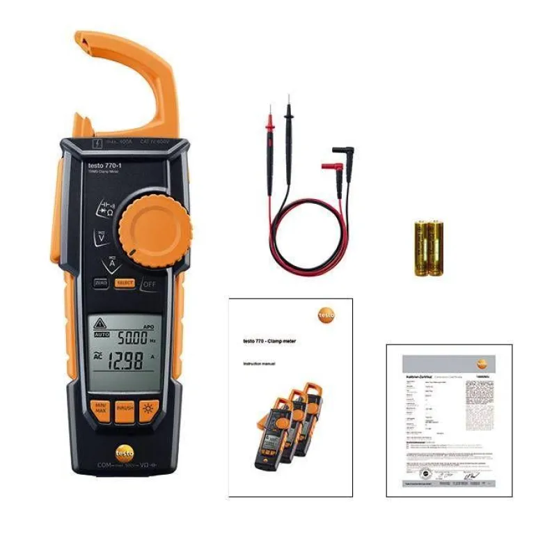 Testo 770-1 -TRMS-virtapihti on ihanteellinen kosketuksettoman virran mittaamiseen laitekaapeista. Yksi tarttumiskynsistä voidaan vetää kokonaan laitteeseen, ja tarttumismekanismin ansiosta kaapeleihin on helppo tarttua ahtaissa kytkentäkaapeissa. Mittausparametrien automaattinen tunnistus takaa luotettavan mittauksen: virta- ja jännitealueella kaikki kolme laitetta voivat havaita DC- ja AC-virran. Ne voivat myös automaattisesti valita muita parametreja, kuten resistanssi, jatkuvuus, diodit ja kapasitanssi.