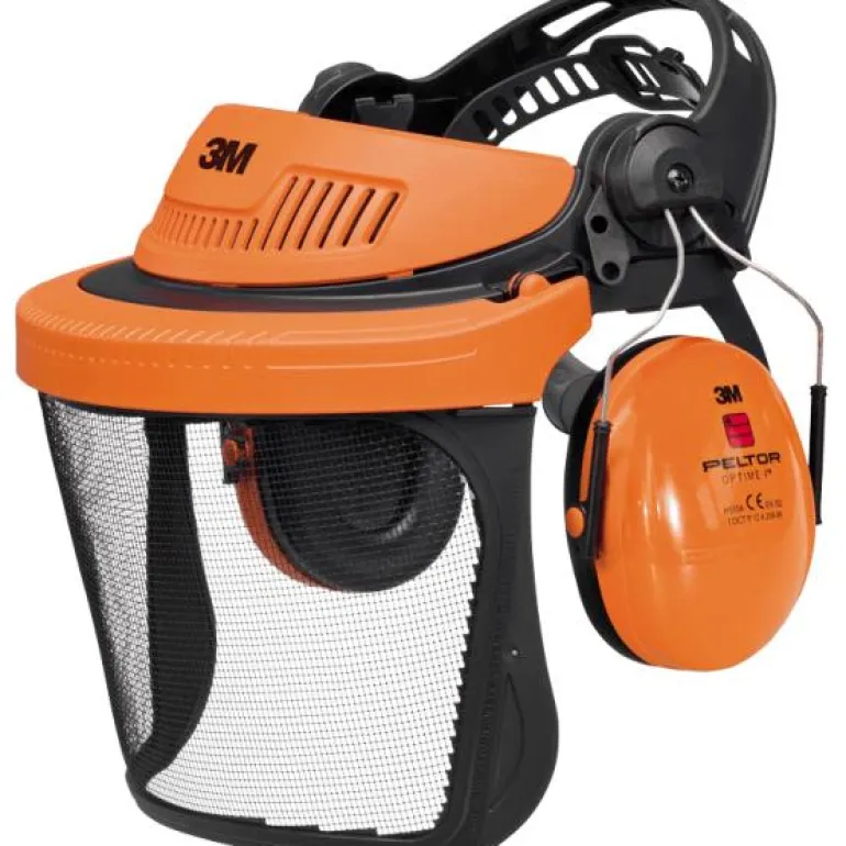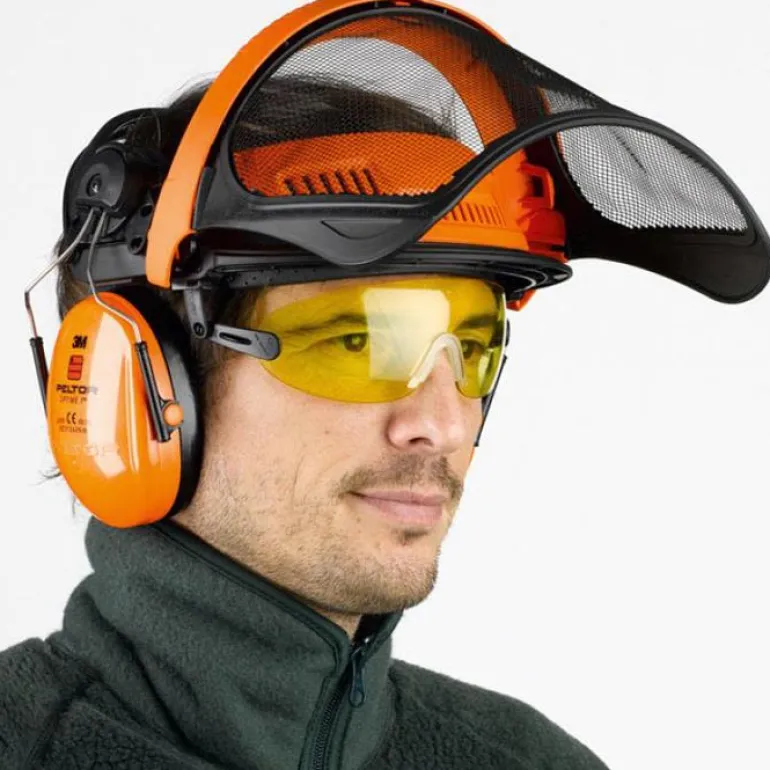 Yhdistelmäsuojain metsänhoitoon. Sisältää kasvonsuojaimen, verkkovisiirin ruostumattomasta teräksestä ja Peltor Optime 1 -kuulonsuojaimet.